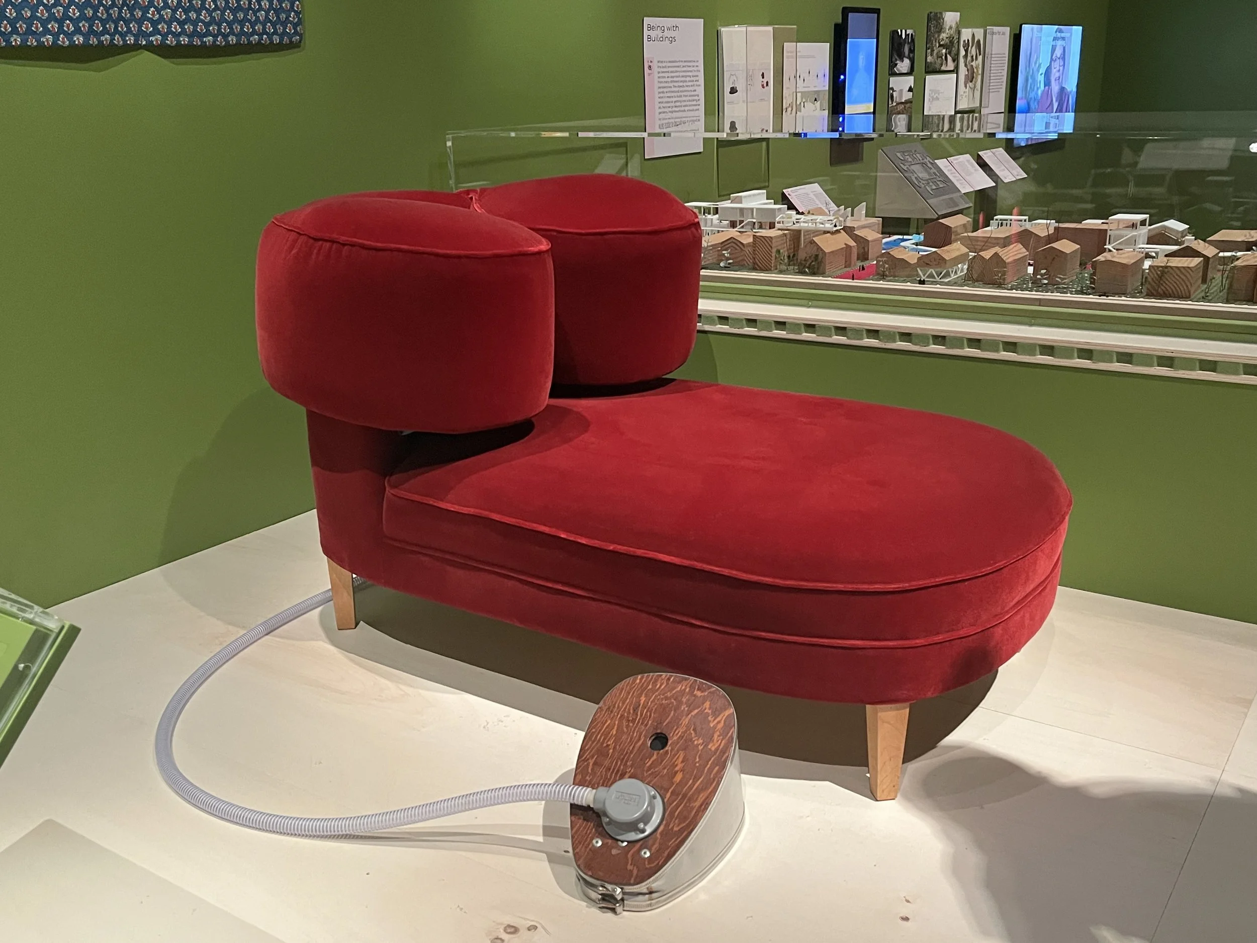 One of the many items on display that caught my attention was the ‘Squeeze Chair’, a collaboration between Wendy Jacob and Temple Grandin. Grandin, a scientist who is diagnosed with autism herself, worked with artist Wendy Jacob to create a lounge chair which essentially gives the person a tight hug. Autistic people often find a ‘squeezing’ sensation can help calm them down and put them at a sense of ease.